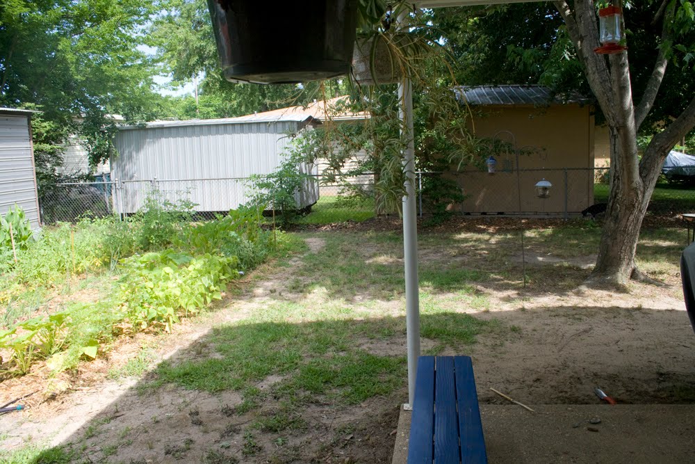 The view from the church. You can see our storage building, the shade we get from the neighbor's beautiful oak tree, and our small plum tree that will one day actually produce plums.